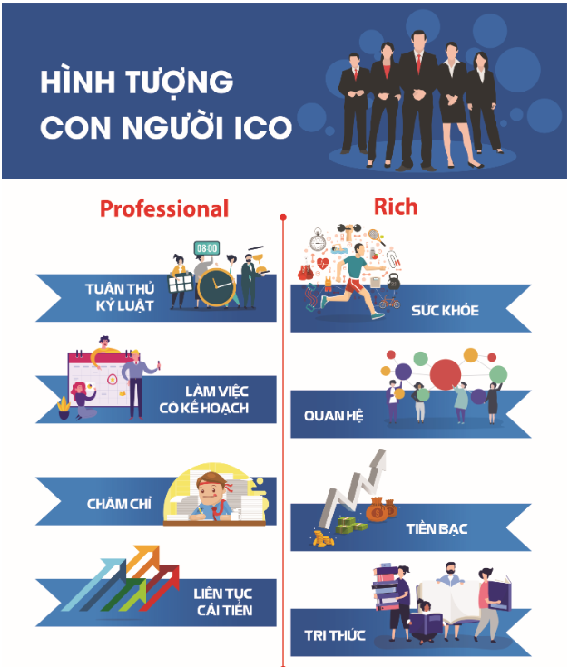 Mở đầu buổi tập huấn, chủ tịch Nguyễn Quang Tuấn đã đưa ra những yêu cầu hết sức cụ thể về hình tượng con người ICO mà mỗi cá nhân trong tập đoàn cần hướng tới. Theo đó, phẩm chất không thể thiếu để xây dựng hình tượng con người ICO Professional and Rich cụ thể là: