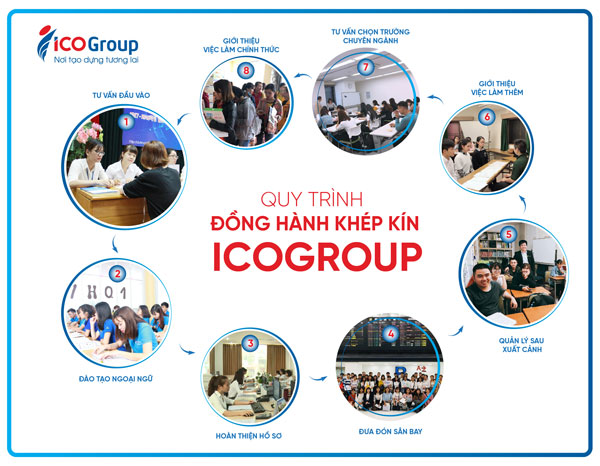 ICOGroup tiên phong thực hiện quy trình đồng hành khép kín nhằm hướng tới việc hỗ trợ tối đa cho các em học sinh một cách chuyên nghiệp, bài bản. ICOGroup sát cánh cùng các em không chỉ ở Việt Nam mà còn trong suốt hành trình học tập, tốt nghiệp tại nước ngoài và đi làm chính thức.