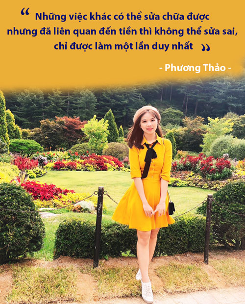 Thảo cũng luôn đề cao tính “cẩn thận” và nhắc nhở mình phải nói không với nhầm lẫn, sai sót. “Những việc khác có thể sửa chữa được nhưng đã liên quan đến tiền thì không thể sửa sai, chỉ được làm một lần duy nhất”, Thảo khẳng định.