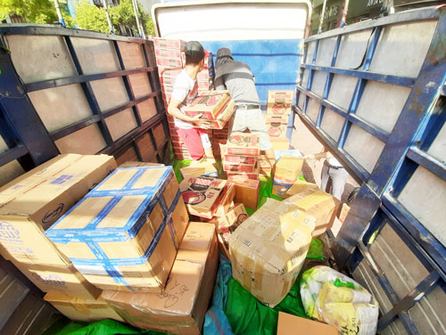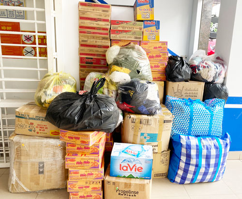 68 thùng mì tôm, 02 thùng lương khô, 06 thùng bánh, 01 thùng nước Lavi và 50 thùng quần áo cũng được vận chuyển từ trụ sở Tập đoàn đi vào vùng lũ