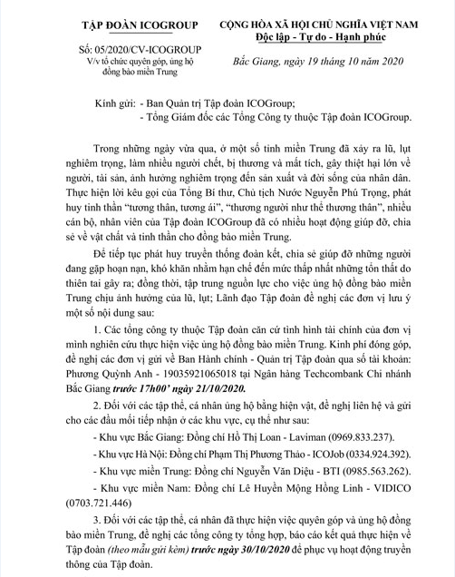 Việc kêu gọi CBNV ICOGroup ủng hộ đồng bào miền Trung khắc phục thiên tai năm 2020 là chủ trương của Ban lãnh đạo Tập đoàn. Các Tổng Giám đốc (Giám đốc) các Tổng công ty, Công ty, các đơn vị thành viên của Tập đoàn cần phối hợp với Ban Hành chính - Quản trị Tập đoàn kêu gọi, vận động cán bộ nhân viên tích cực tham gia, hưởng ứng.