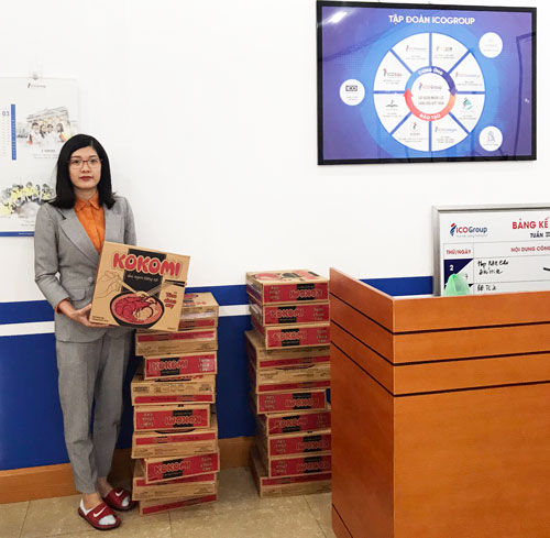 Các hiện vật là áo phao, mì tôm cũng được gửi đến văn phòng ICOGroup để chuyển cho đồng bào miền Trung